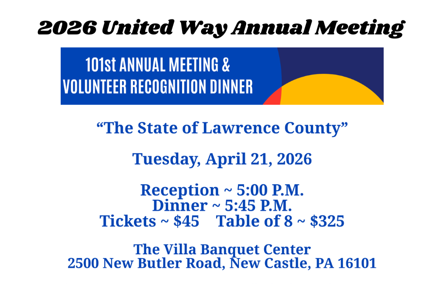 Please join us at our 101st United Way Annual Meeting on Tuesday, April 21, 2026. All information is on the flyer. Please call the UW office for reservations. 724658-8528