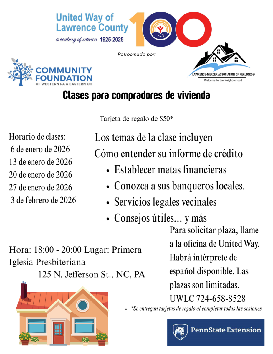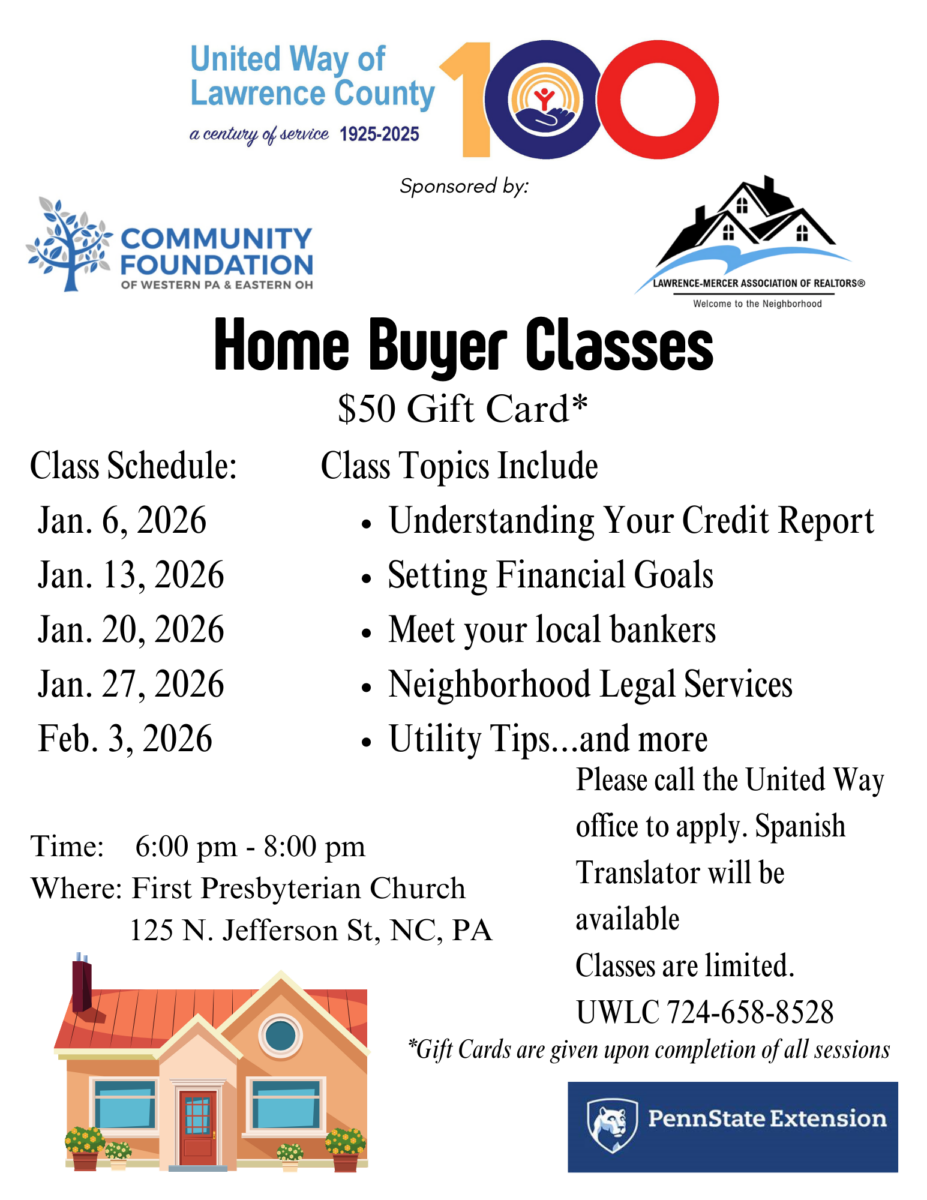 United Way offers Home Buyer Classes to those in our community that would like to learn more about owning their own home. Class Topics include: Understanding Your Credit Report, Setting Financial Goals, Meet Your Local Bankers, Neighborhood Legal Services, Utility Tips…and MORE!   Participants that complete all sessions will receive a $50 Gift Card. Please register online Click here to sign-up online or call 724-658-8528.